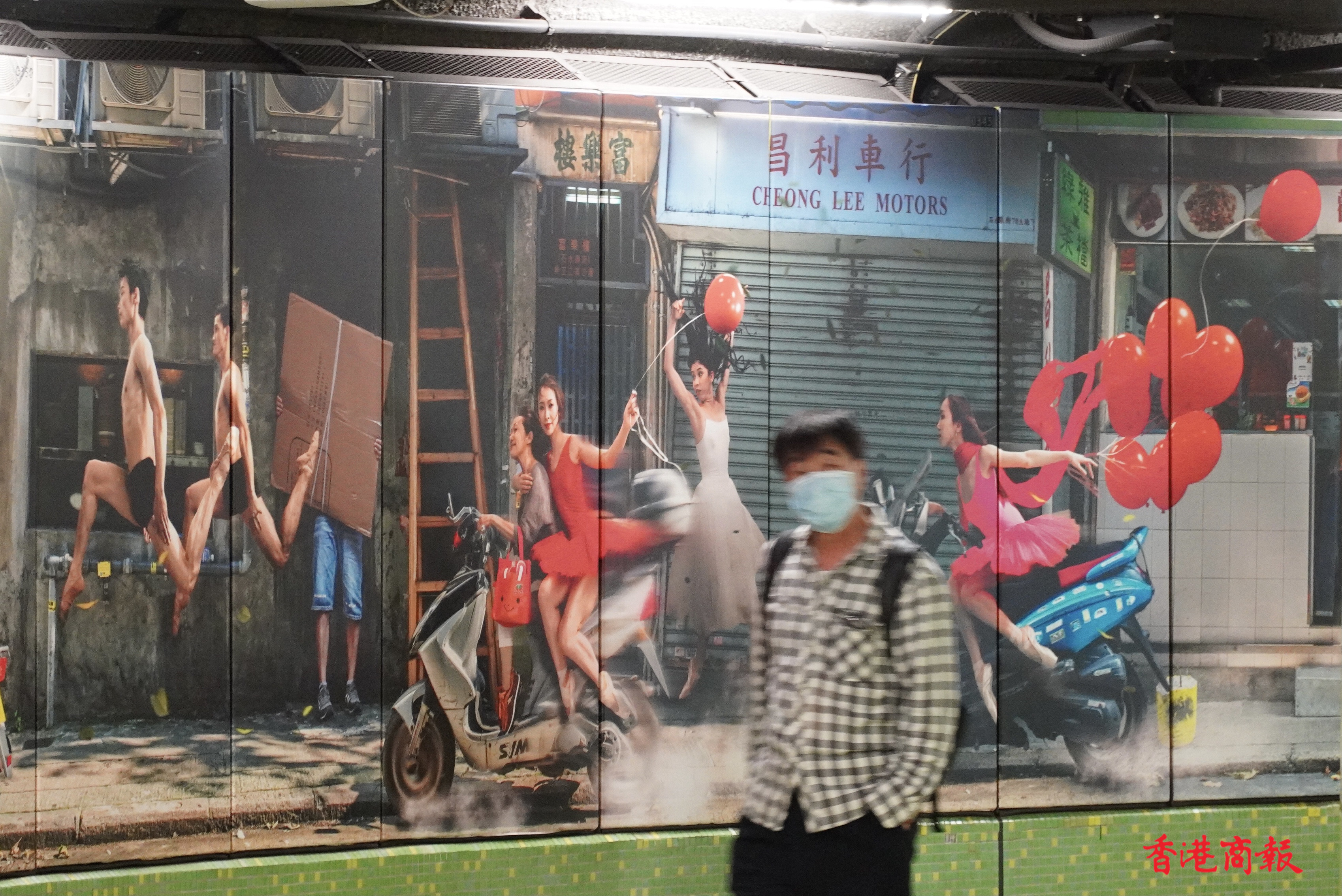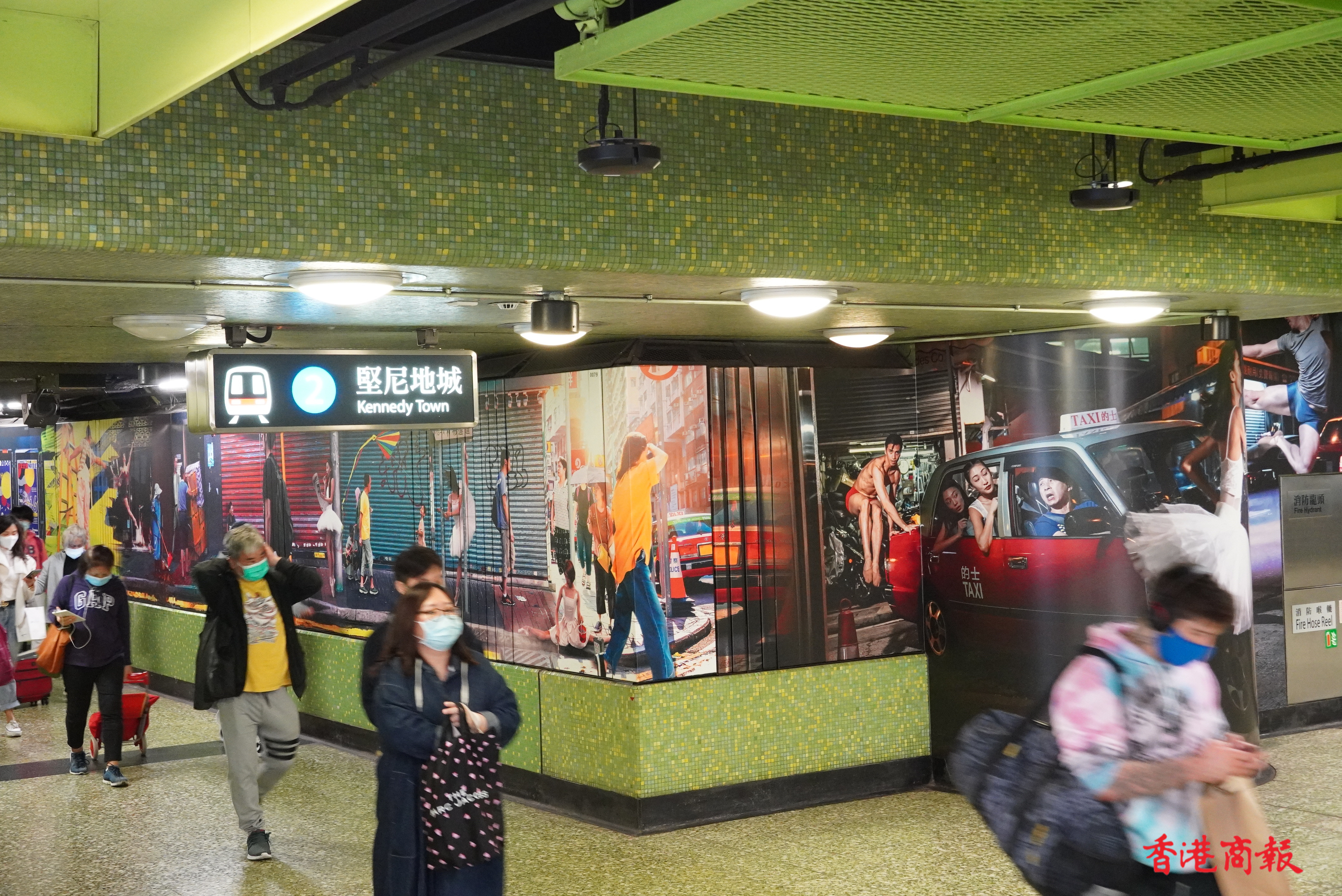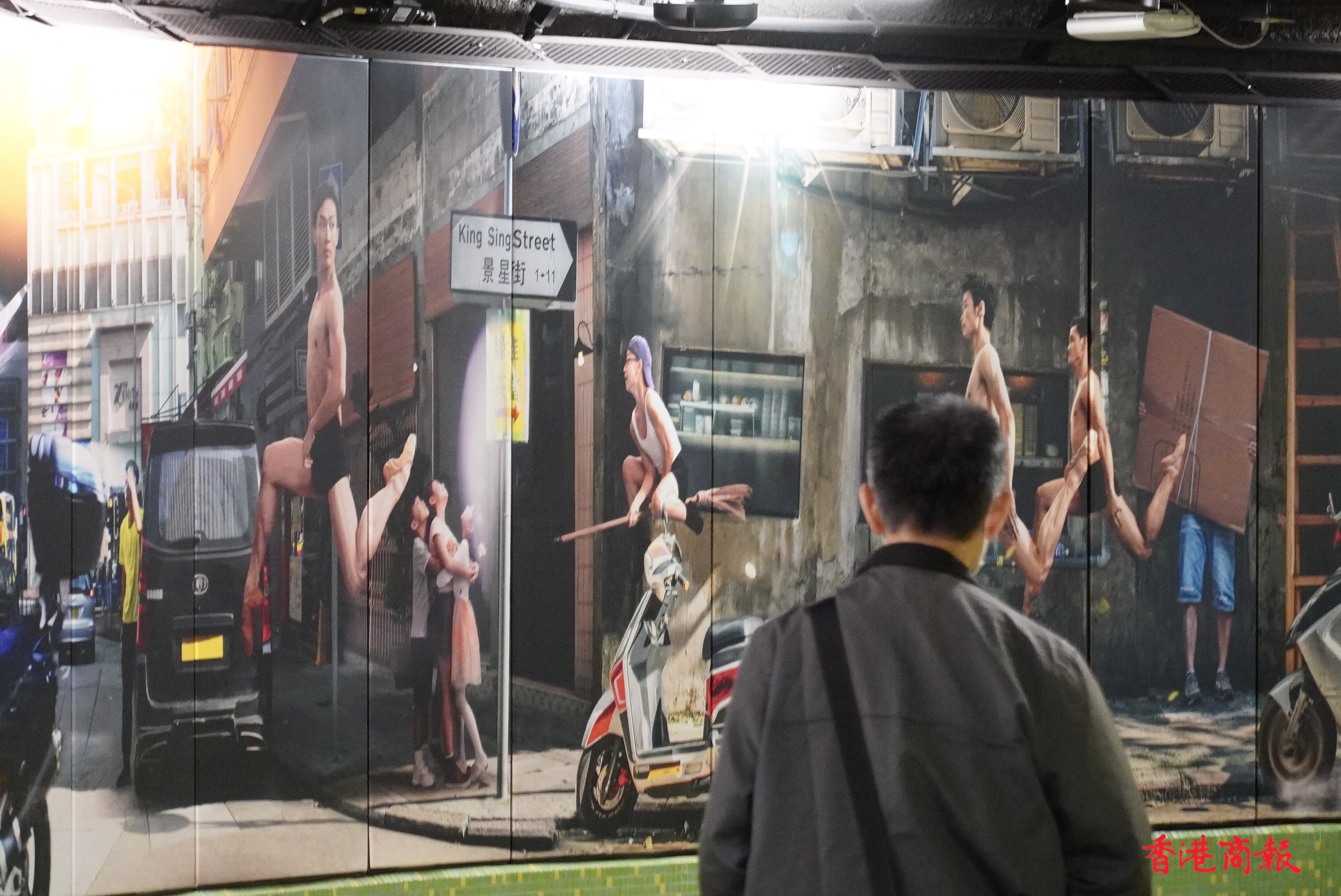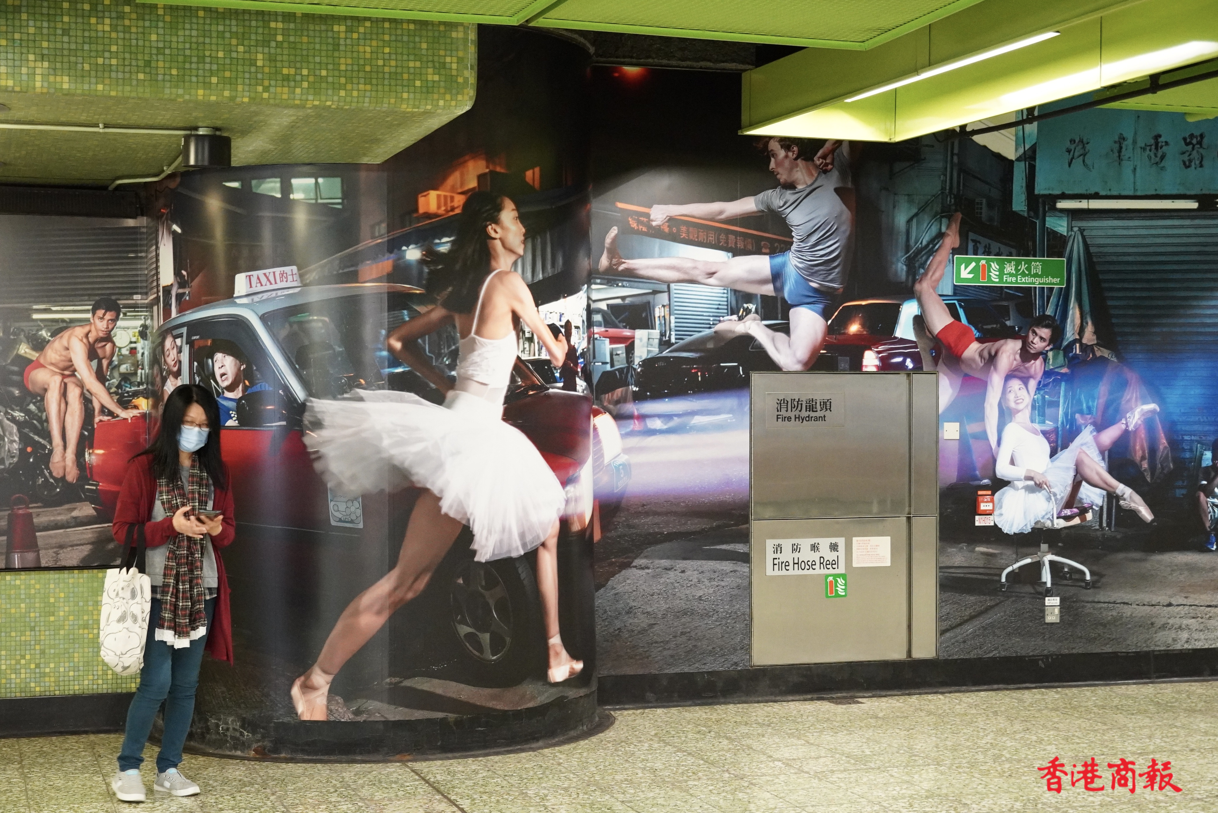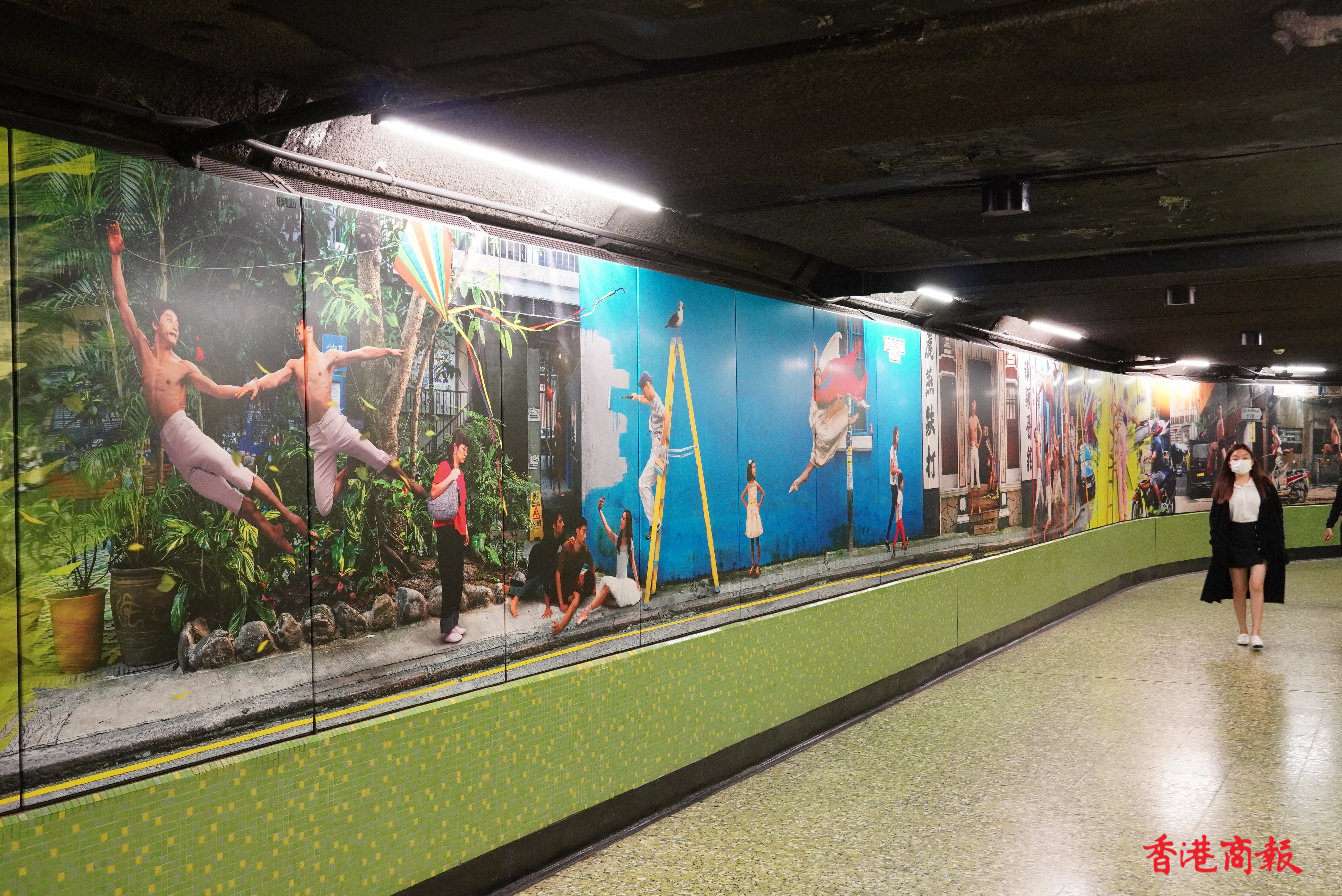 繁忙的港鐵灣仔站,牆壁上出現了約長一百五十米「這是灣仔」的大型攝影藝術裝置。作品由多媒體藝術家Jevan Chowdhury構思,共有40多名舞蹈員及巿民參與其中。鏡頭捕捉了香港芭蕾舞團的舞蹈員,在灣仔不同街道和行人的互動的舞姿。作品通過現實與想像交融的鏡頭,紀錄「人生如戲,戲如人生」的日常生活面貌。港鐵灣仔站彷如化身為生動的表演舞台,讓乘客途經時可以樂在其中,感受藝術氣氛。(馮俊文 攝)