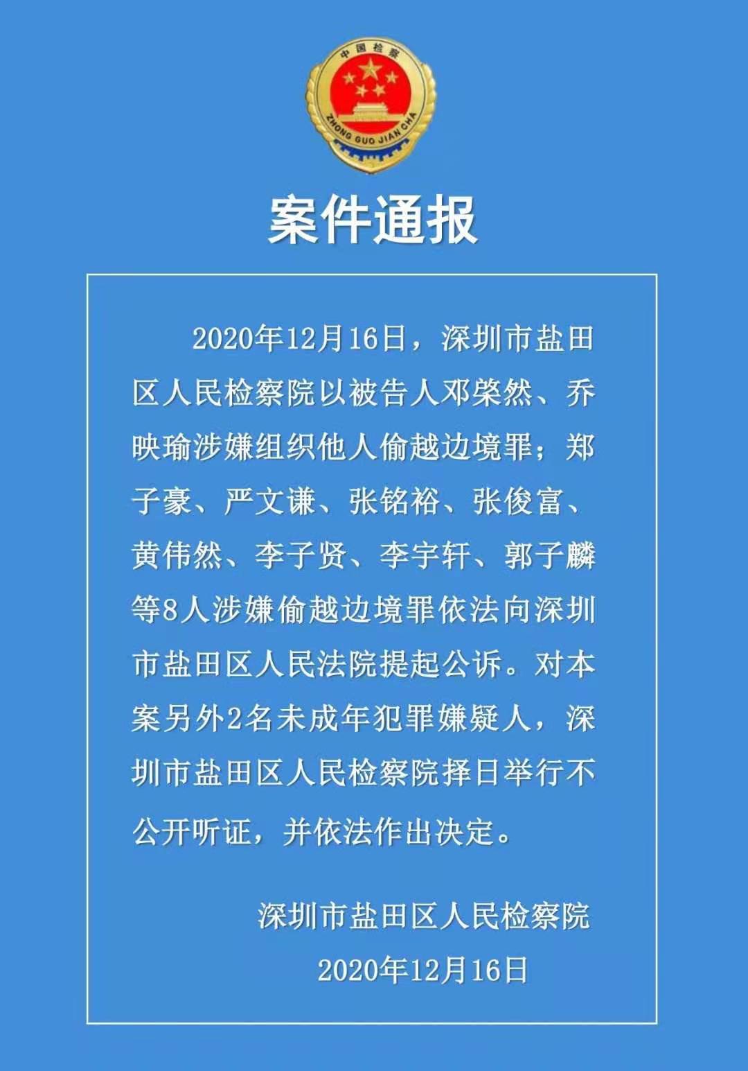 12月16日,深圳市鹽田區人民檢察院发布通告称,深圳市鹽田區人民檢察院以被告人鄧棨然、喬映瑜涉嫌組織他人偷越邊境罪;鄭子豪、嚴文謙、張銘裕、張俊富、黃偉然、李子賢、李宇軒、郭子麟等8人涉嫌偷越邊境罪依法向深圳市鹽田區人民法院提起公訴。對本案另外2名未成年犯罪嫌疑人,深圳市鹽田區人民檢察院擇日舉行不公開聽證,並依法作出決定。