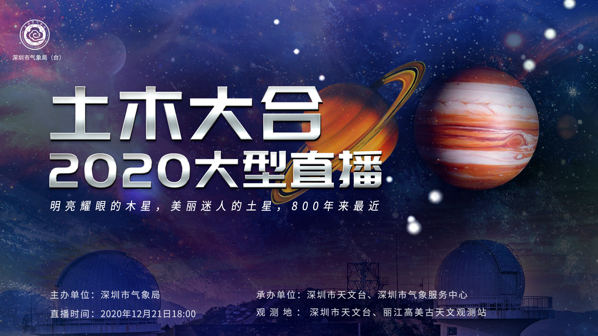 據介紹,深圳市氣象局主辦的網絡直播將於12月21日18:00開始,直播小組將在深圳市天文台和麗江高美古天文觀測站,將望遠鏡視角裏的土星木星畫面通過網絡為廣大天文愛好者實時呈現,除深圳天氣各自媒體、i深圳、深圳發布外,還有深圳特區報的讀特、深圳衛視、壹深圳、新浪科技、抖音等各大平台直播。