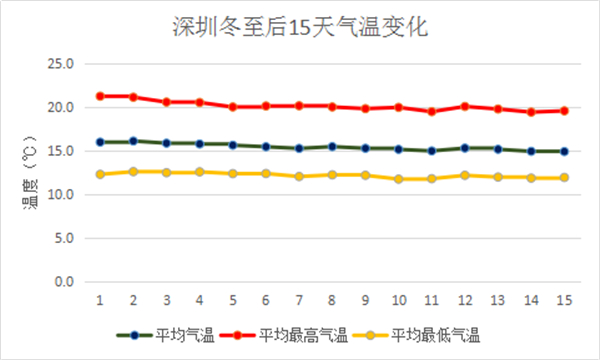 根據歷史的氣象數據統計,冬至當天深圳的平均氣溫為16.2℃。冬至後15天的日平均氣溫變化幅度不大,平均氣溫為15.4℃,平均最高氣溫為20.2℃,平均最低氣溫為12.2℃。受冷空氣影響,冬至後15天日最低氣溫曾降至1.9℃,出現在1973年12月31日。冬至節氣期間深圳的寒冷天氣平均4天。此時晝夜溫差較大,達到8℃。早上衛衣,中午短袖,晚上羽絨服是深圳人「冬天」的寫照。