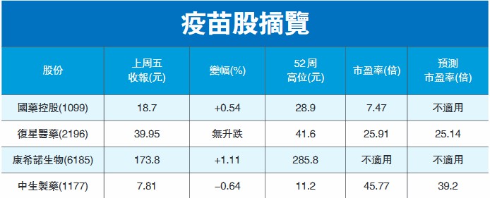 全球新冠肺炎疫苗競賽進入衝刺階段,各國部署大規模接種新冠肺炎疫苗,帶動疫苗股再掀炒風,多隻疫苗股包括國藥控股(1099)、復星 醫 藥(2196)、康希諾生 物(6185)、中生製藥(1177)近日持續造好。分析認為,疫苗股或可短炒一轉,惟現水平不宜高追。