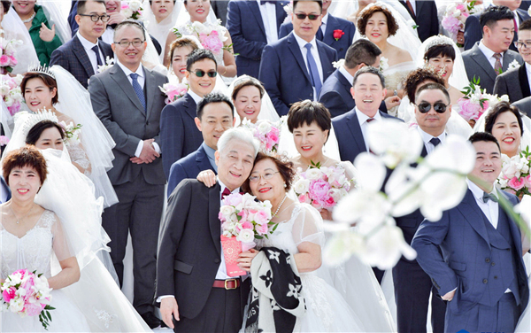 當日上午10點,108對「新人」仿佛又穿越回了年輕時候。「當你老了,請你取下我為你寫就的詩篇,裝進歲月的花瓶,放在灑滿月光的窗台。荏苒的光陰將你的容顏侵蝕,那一瞬間,所有往事都吟成了一首首細膩柔情的歌謠。」在舞台上,相伴幾十年的愛人,共同讀著這首愛情誓言,為愛人送出了曾經缺失的新婚禮物,戴上鑽戒。