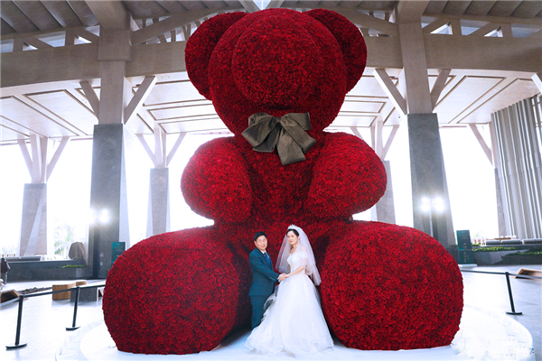 新人們與由萬朵玫瑰花拼成的「最大玫瑰花熊」合影。(陳銳攝)