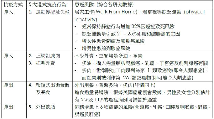 香港防癌會在11月13日至27日進行「抗疫『新常態』下港人飲食及運動習慣轉變與致癌風險」調查,合共訪問了1094人。結果顯示,75%受訪者表示新冠肺炎疫情嚴重時應多留在家;47%受訪者在新冠肺炎疫情嚴重時期減少了運動量。