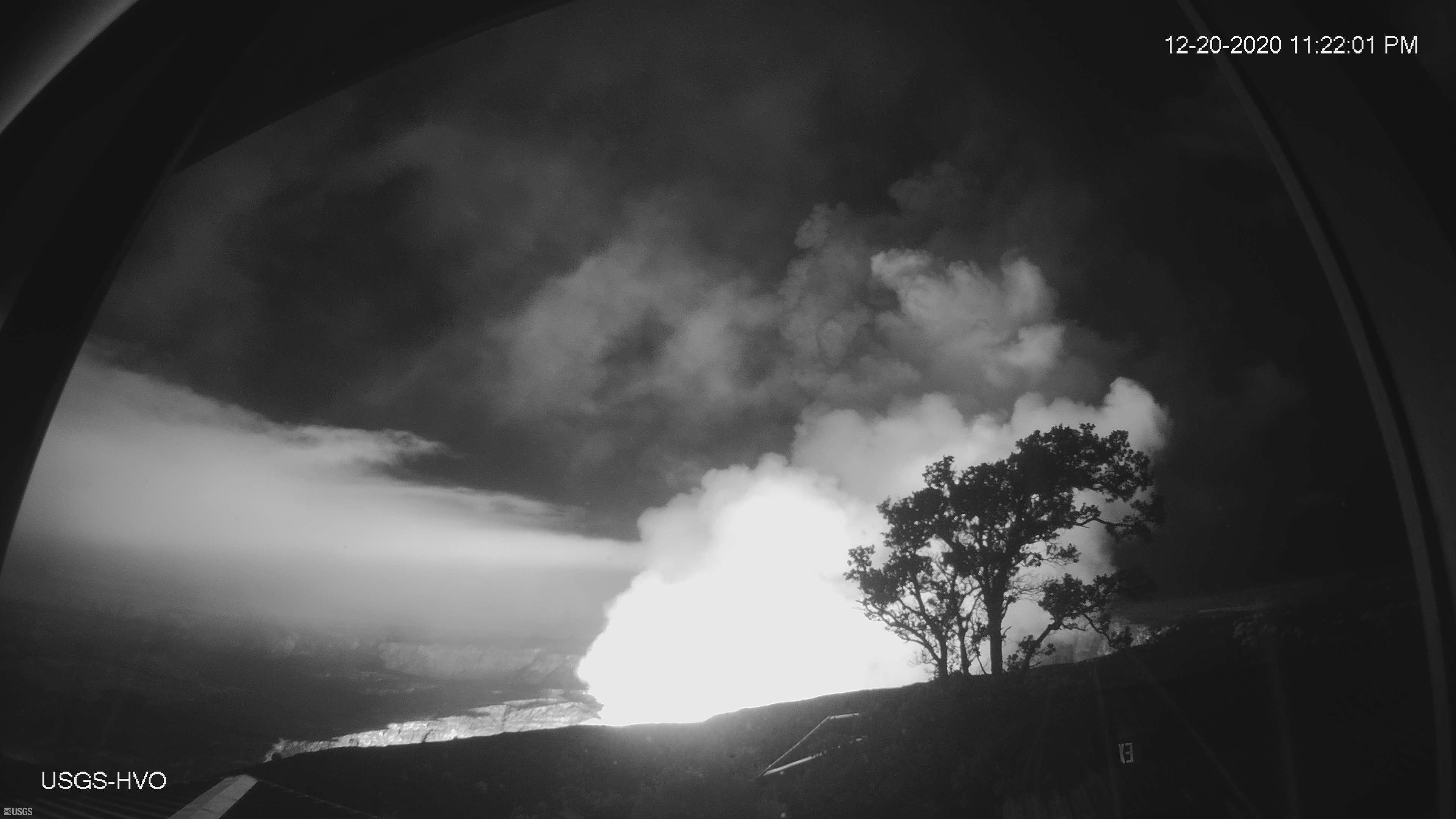 美國地質調查局(USGS)的網絡攝像頭照片顯示,2020年12月20日,夏威夷基拉韋厄火山的Halema'uma'u火山口噴發後,北部裂隙在約50米處產生熔岩噴泉( 2020年12月21日發布)。 根據美國地質調查局和夏威夷火山天文台(HVO)的說法,基拉韋亞山頂火山口已開始噴發,隨後在火山南翼發生了4.4級地震。 在火山噴發期間,火山口底部的湖水被熔岩所取代。 (歐新社)