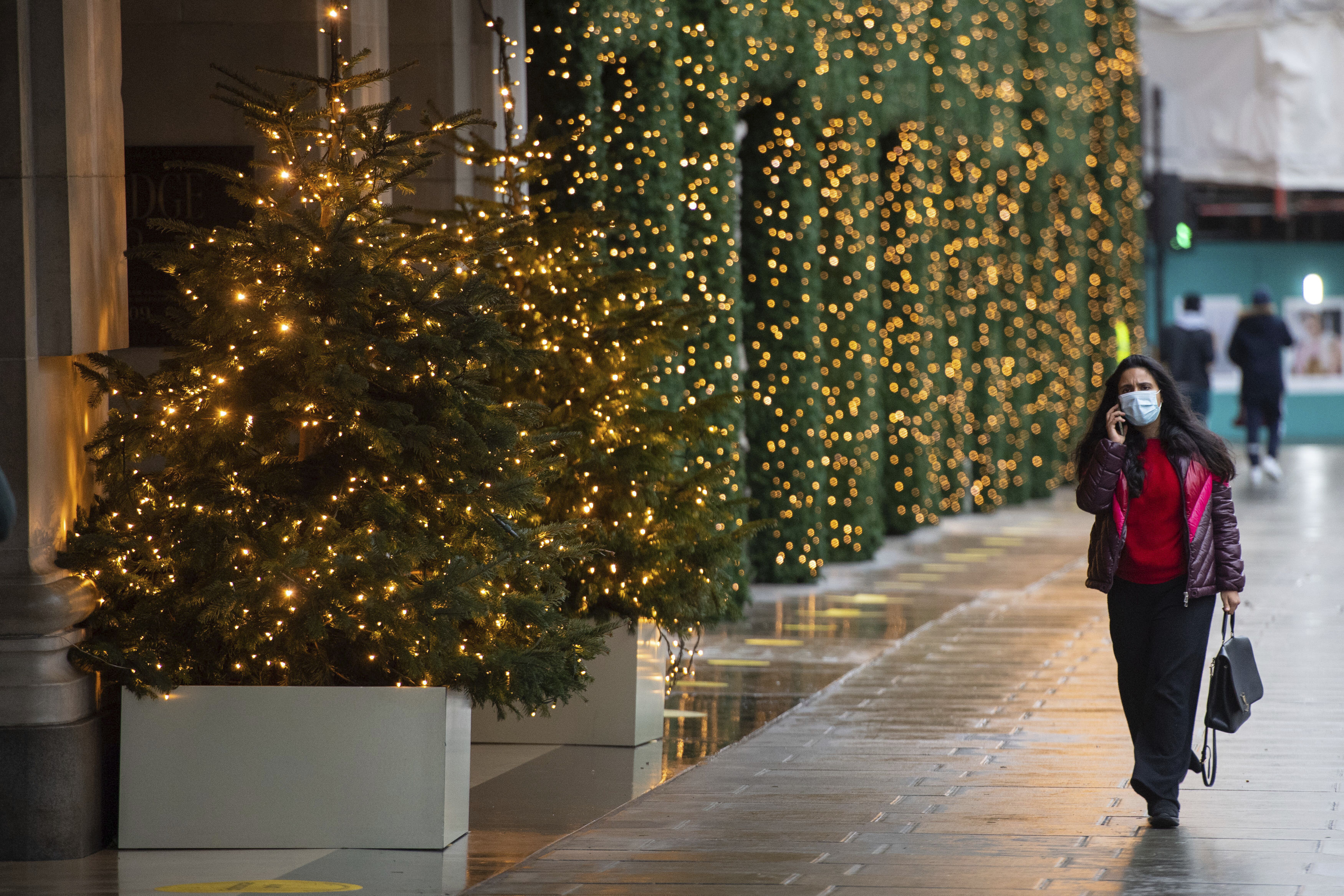 12月21日,在英國倫敦牛津街,人們從關閉店鋪前亮燈的聖誕樹旁走過。