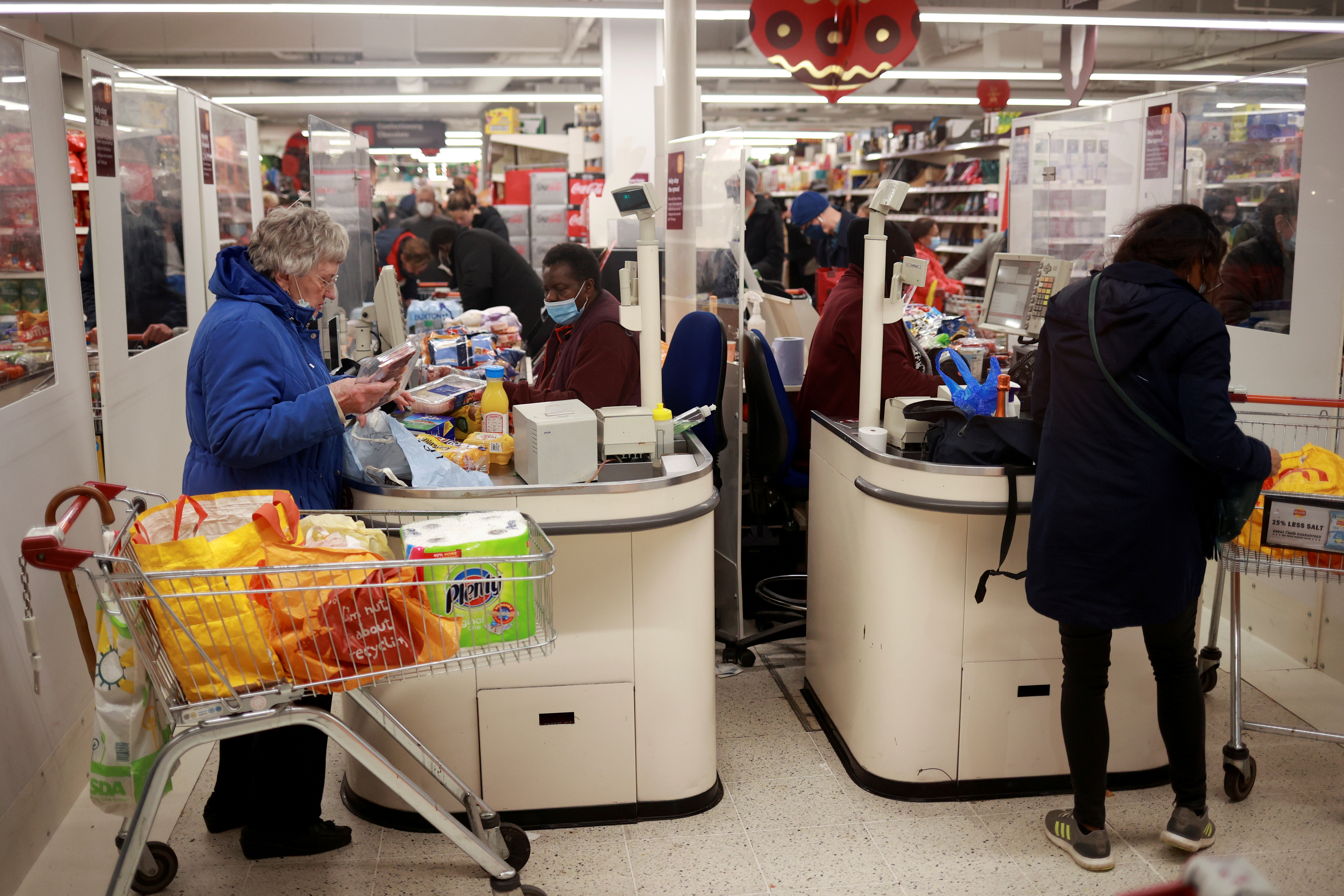 12月21日,英國倫敦,人們在商店排隊結帳。路透社