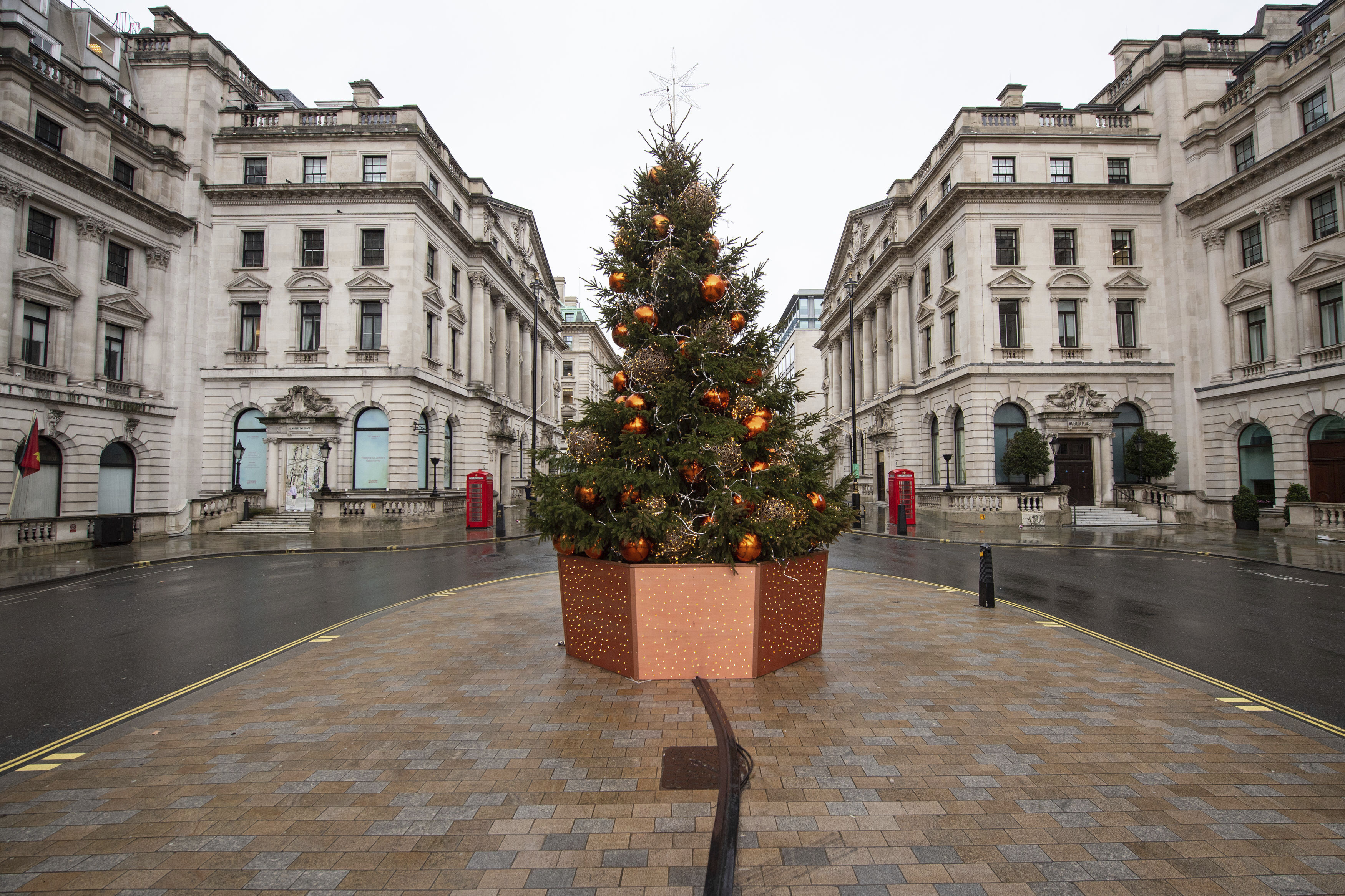 12月21日,英國倫敦攝政街上的聖誕樹。美聯社