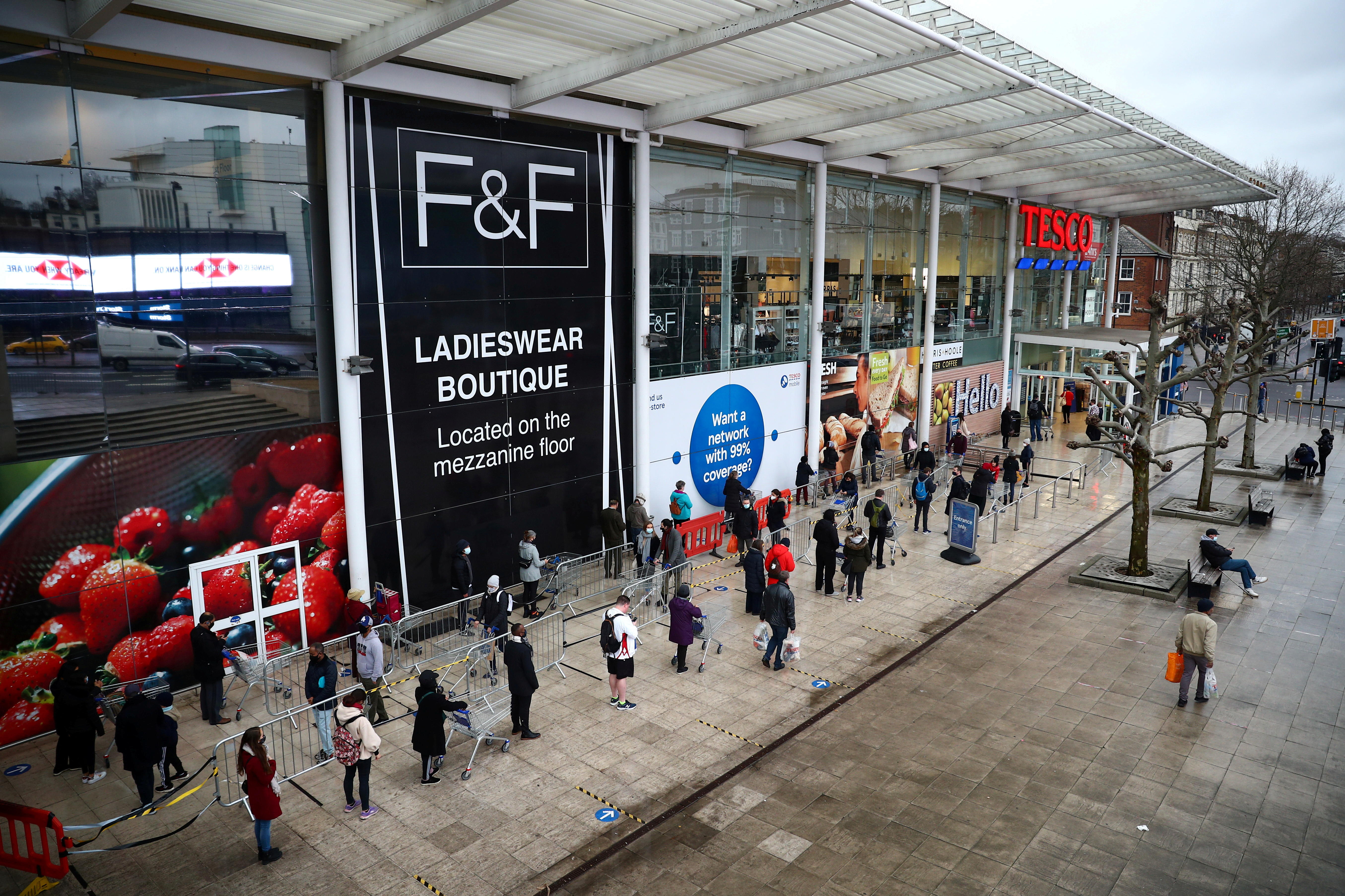 12月21日,在英國倫敦,人們進入超市前排隊等待。路透社