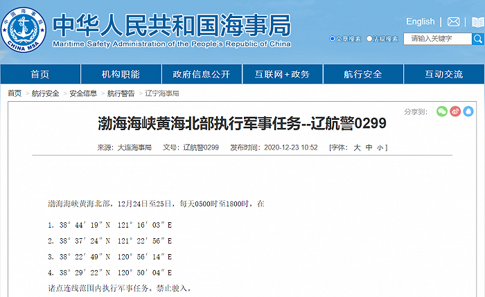 大連海事局發布航行警告:渤海海峽黃海北部,12月24日至25日,每天0500時至1800時,在