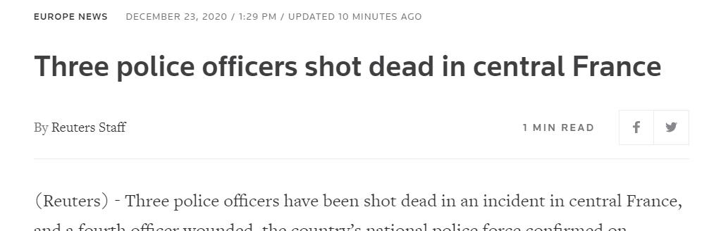 據路透社23日報道,法國中部3名警察被槍殺。當地時間22日晚,在法國聖賈斯特附近的一個偏僻小村莊,4名警察接到家暴報警后,趕往事發地解救一名女子,其中3名警察被一名不知名的男子槍殺,另有一名警察受傷。