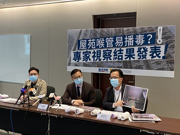 鑑於柴灣峰華邨的秀峰樓和曉峰樓,本月接連出現2宗及3宗確診個案,更有源頭不明個案,令人憂慮屋苑喉管設計是否播毒元兇。民建聯立法會議員張國鈞、與東區支部主席洪連杉連同水務專家潘景和(英國特許水務學會資深會員),上周日前往柴灣峰華邨秀峰樓調查喉管狀況。
