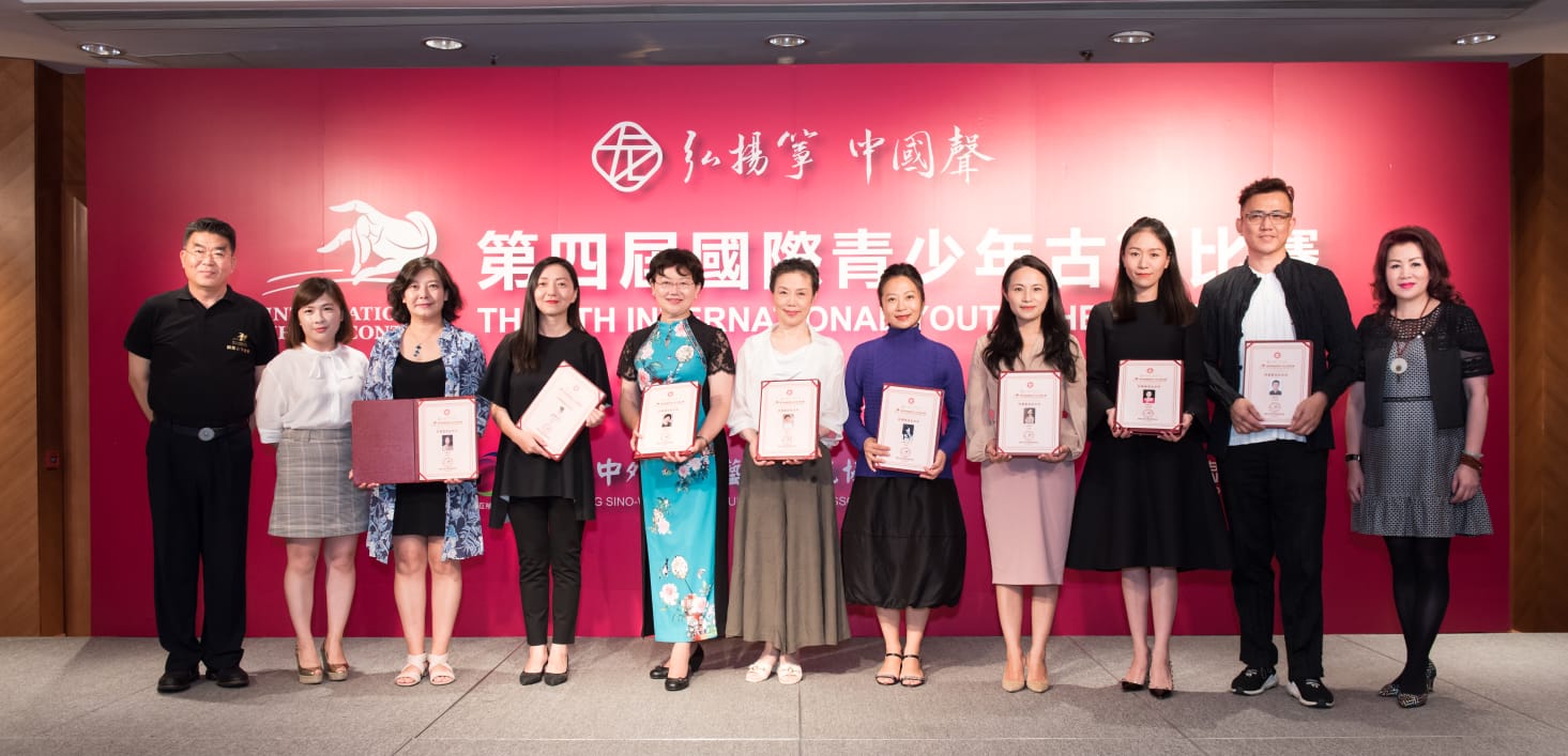 楊濤(左一)、香港中外文化藝術交流協會理事長陳曉薇(右一)與第四屆國際青少年古箏比賽評委合照。