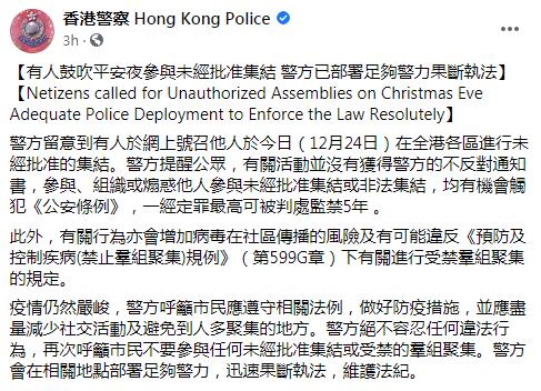 警方今日(24日)在社交媒體發文表示,留意到有人在網上號召他人今日在香港各區進行未經批准的非法集結。警方會在相關地點部署足夠警力,迅速果斷執法,維護法紀。