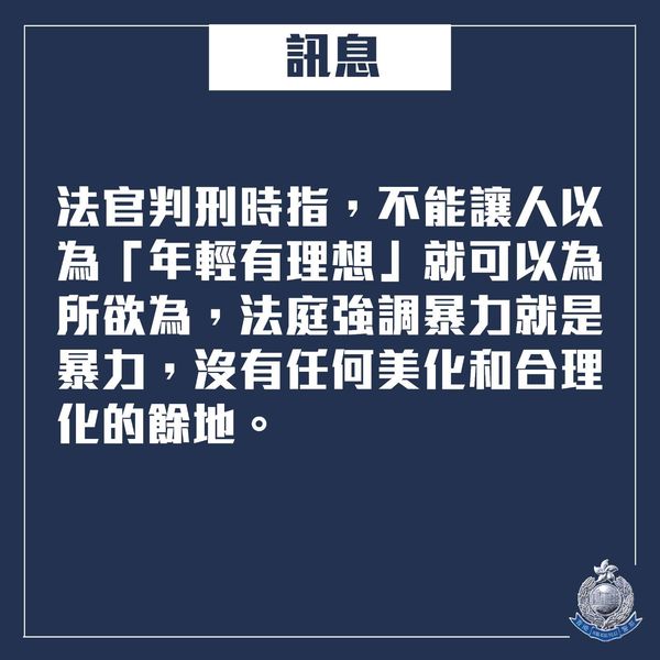警方引述法官判刑時指,不能讓人以為「年輕有理想」就可以為所欲為,法庭亦強調暴力就是暴力,沒有任何美化和合理化的餘地。