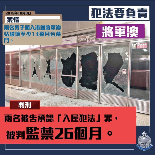 警方指兩人涉及於2019年10月8日淩晨闖入港鐵將軍澳站破壞至少14道月台幕門的事件,導致港鐵須支付逾200萬元維修費。