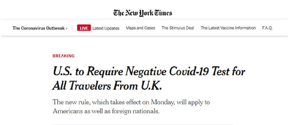 據美國《紐約時報》報道,當地時間24日,美國疾控中心(CDC)表示,美國將要求所有從英國入境航班旅客出示登機前72小時內的新冠病毒核酸檢測陰性證明。報道稱,這項新規將於下周一(28日)正式實施。