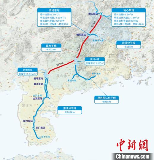記者了解到,該工程從西江幹流雲浮鬱南地心取水,經泵站加壓後從羅定西部至茂名高州水庫,調蓄後引水至湛江鶴地水庫,並向雲浮、茂名、陽江和湛江市供水,連通高州、鶴地等12座水庫。
