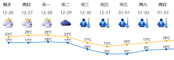 26日多雲,氣溫17-23℃;27-28日多雲到晴天,部分時間有輕霧或輕微霾;29日多雲,間中有小雨;29日夜間起受寒潮影響,氣溫驟降,北風加大,天氣寒冷。