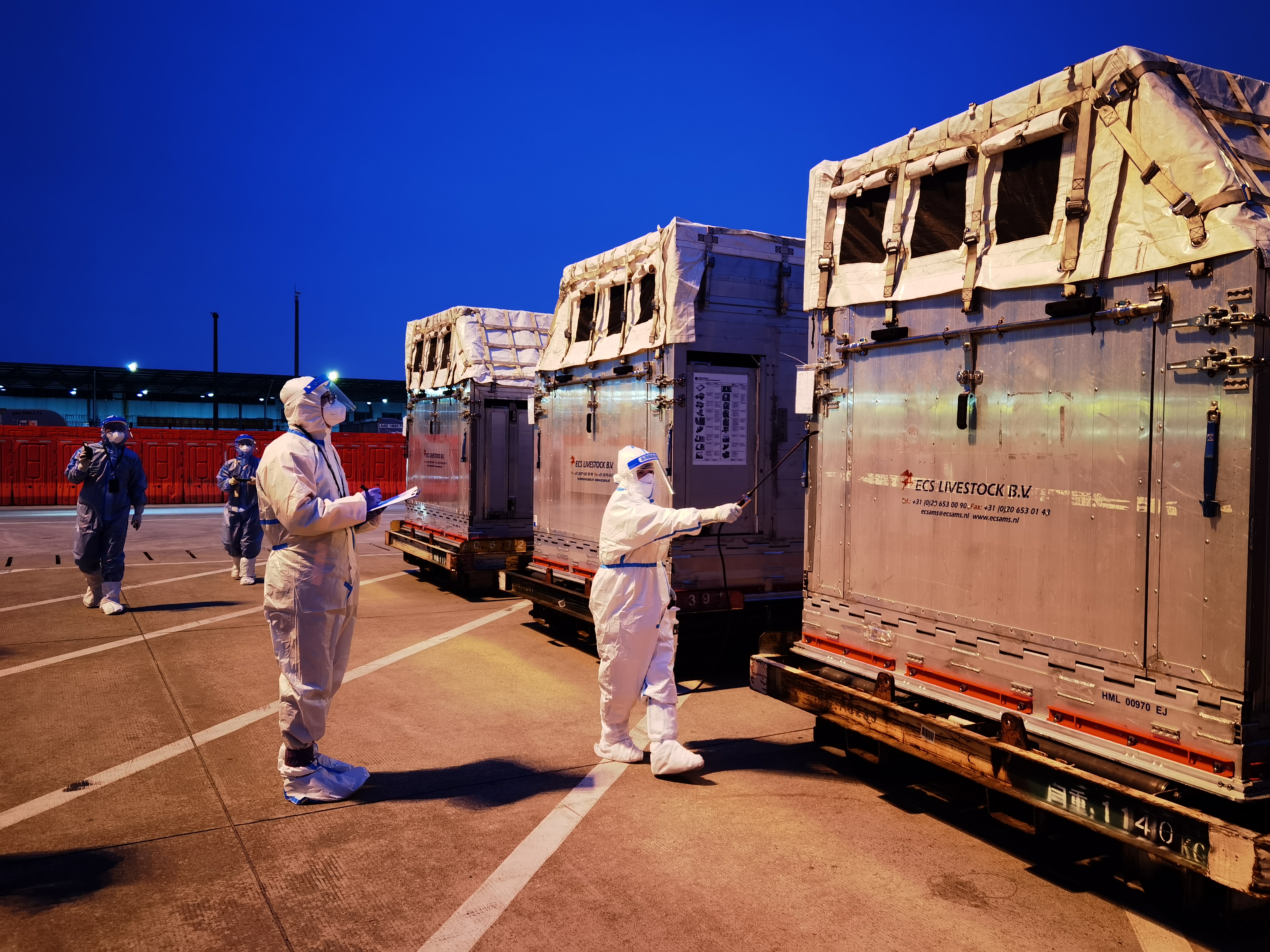 廣州白雲機場海關關員指導工作人員對進境馬匹運輸箱進行預防性消毒(攝影:孫佳純)