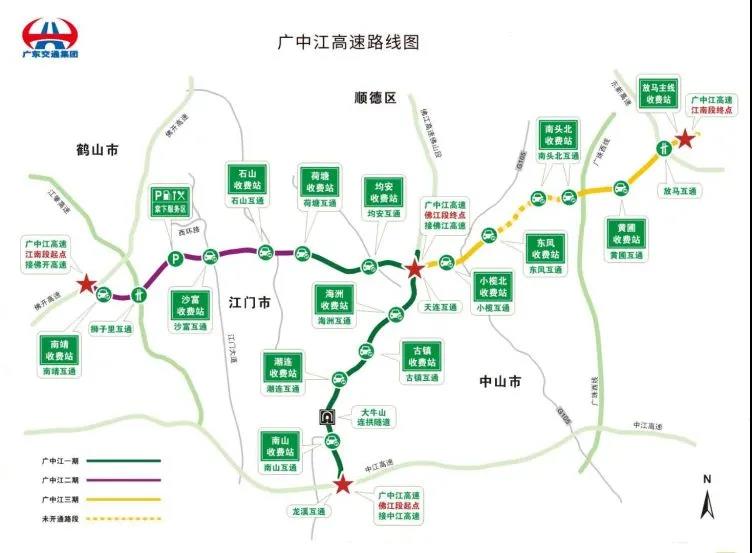 12月28日上午10時08分,廣中江高速公路三期於正式開通(除公鐵共建段外)。項目三期工程起於本項目位於佛山順德區均安鎮的天連互通,終於廣州南沙區大崗鎮,呈東西走向,長約24公里(不含共建段約18公里),採用雙向六車道設計,時速100公里。該項目通車後,粵港澳大灣區居民出行又有新的路線選擇。此前,項目的一期、二期工程分別於2016年、2017年建成通車。