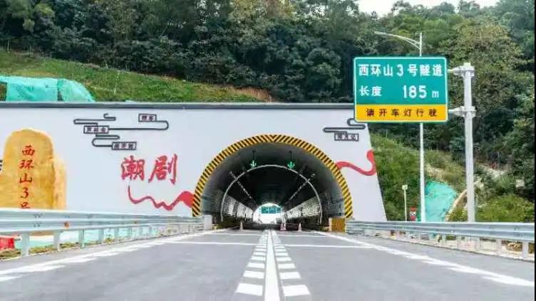 在這條高速公路上,一出無聲的「印象潮汕」正在上映,「膠己人」故事緩緩流淌,在沿線隧道洞門上繪製了一幅幅「潮汕畫卷」,因地制宜地展現「潮」文化,隧道洞門牆的彩繪設計融合了「潮汕民居」、「潮汕功夫茶」、「潮劇」等極具特色的「潮汕元素」。其中,在西環山3號隧道洞口文化端牆設計中,專門融入了擁有「南國奇葩」美譽的潮劇,在端牆之上簡單明了的點綴各篇譽滿潮汕的戲劇匾額,同時別具匠心地結合周邊自然山水之勢,將具有潮汕特色建築「古城」城牆融入端牆頂端,獨具一格。
