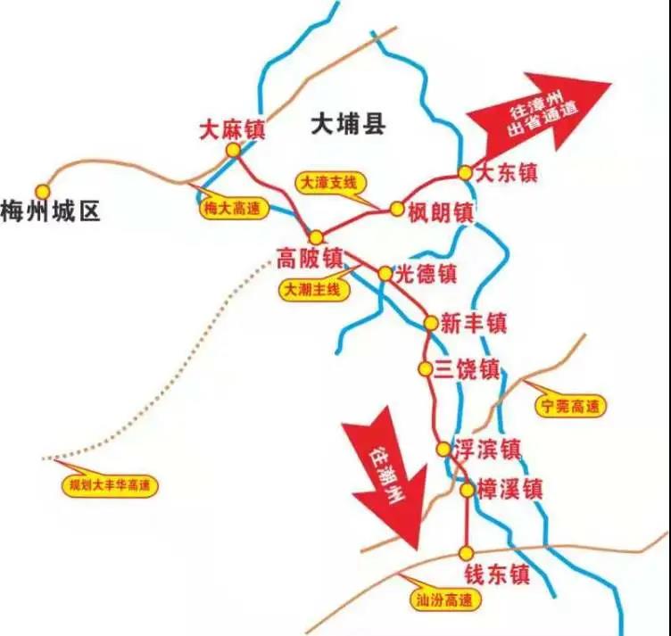 此前梅州大埔至潮州饒平並無高速公路相連,走地方路需2個半小時左右。大潮高速通車後,大埔至饒平、廈門車程均可縮短一小時以上,將進一步補齊粵東北山區基礎設施短板,大大解決梅潮兩地蜜柚、茶葉等農產品及高陂瓷器的運輸問題,也能更好地發展兩地的旅遊業,為大埔、饒平等原中央蘇區縣插上騰飛的翅膀,成為促進老區蘇區經濟發展的大動脈。