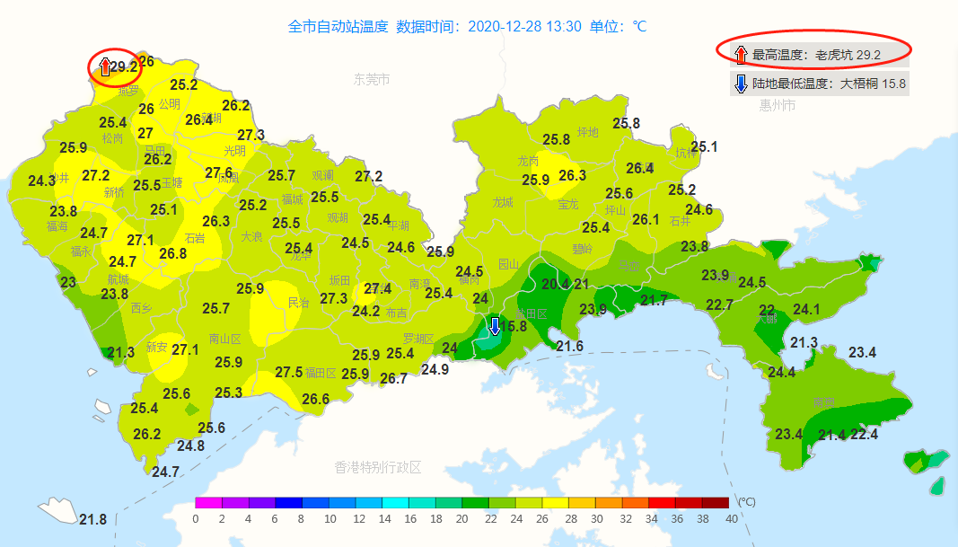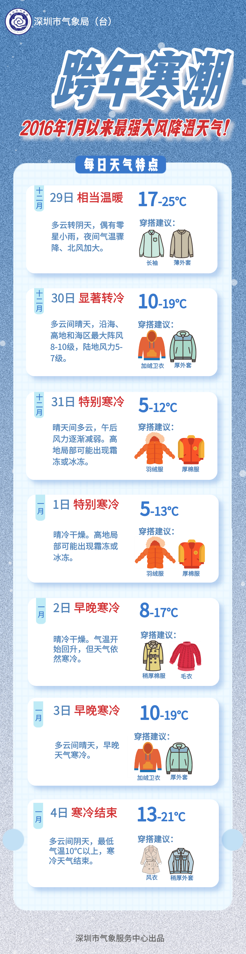過程最低氣溫4-5℃:12月31日、1月1日早晨最低氣溫進一下降至4-5℃(為過程最低氣溫),梧桐山、七娘山、深汕區蓮花山等高地可能有霜(冰)凍,2-3日氣溫開始回升,但天氣依然寒冷,最低氣溫8-10℃,4日最低氣溫10℃以上,寒冷天氣結束。