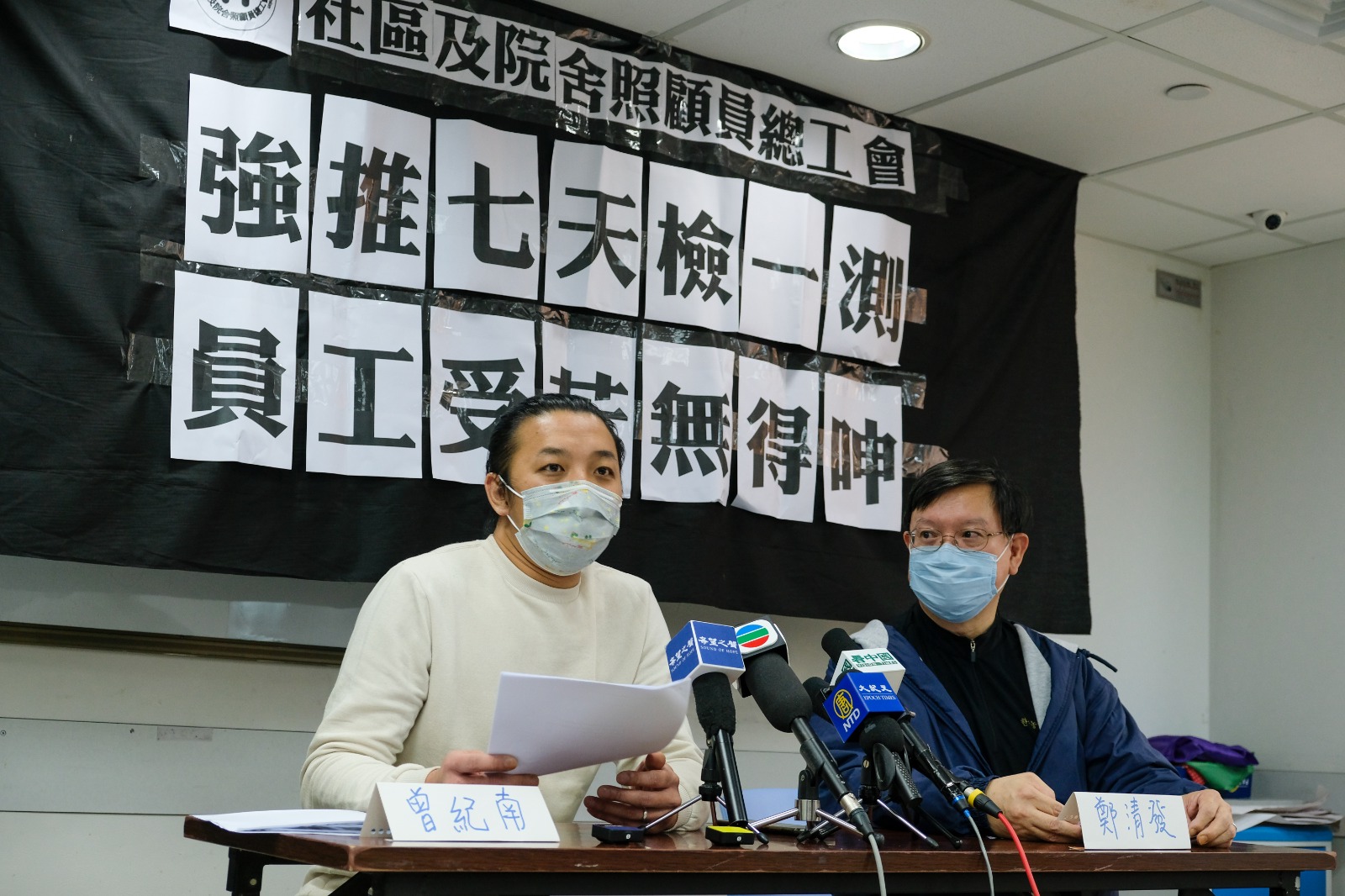 社區及院舍照顧員總工會認為「七天一檢」的安排認為過於頻密,政府應先暫緩有關的安排,工會亦要求政府沿用自願檢測的方式,派員到院舍採樣,以減低對員工及服務使用者的影響;政府同時應該避免用入侵式檢測方法,以減低對員工的傷害及滋擾。工會也表示反對政府以強制方式要求市民接種疫苗,指出市民應有自主權決定是否接種,並且需要清晰知道疫苗的來源地、成份及可能的副作用。