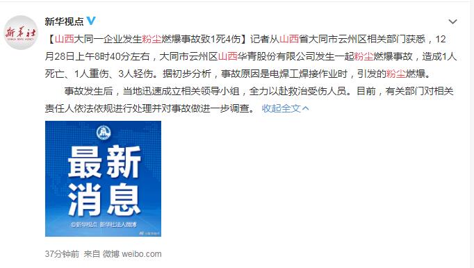 據山西省大同市雲州區相關部門透露,12月28日上午8時40分左右,大同市雲州區山西華青股份有限公司發生一起粉塵燃爆事故,造成1人死亡、1人重傷、3人輕傷。