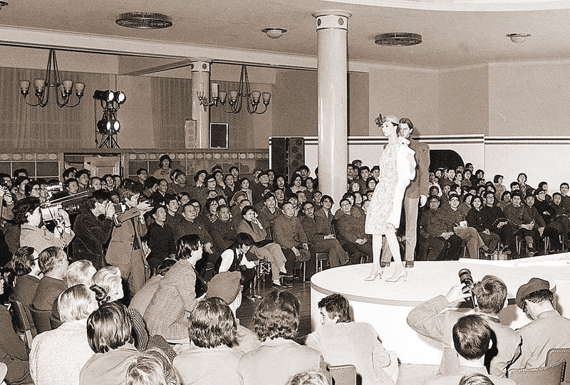 1979年3月19日,由法國著名時裝設計師皮爾·卡丹率領的法國時裝表演團在北京民族文化宮舉行了一場服裝表演。(新華社)