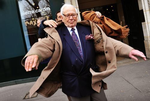 2013年12月2日,在法國巴黎的皮爾·卡丹總部外,皮爾·卡丹穿上外套準備步行回家。(新華社)
