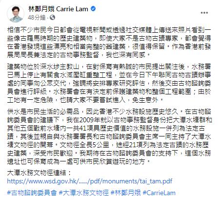 林鄭月娥指,她期待在古物諮詢委員會的支持下,這個水務遺址也可保育成為一處可供市民欣賞遊玩的地方。