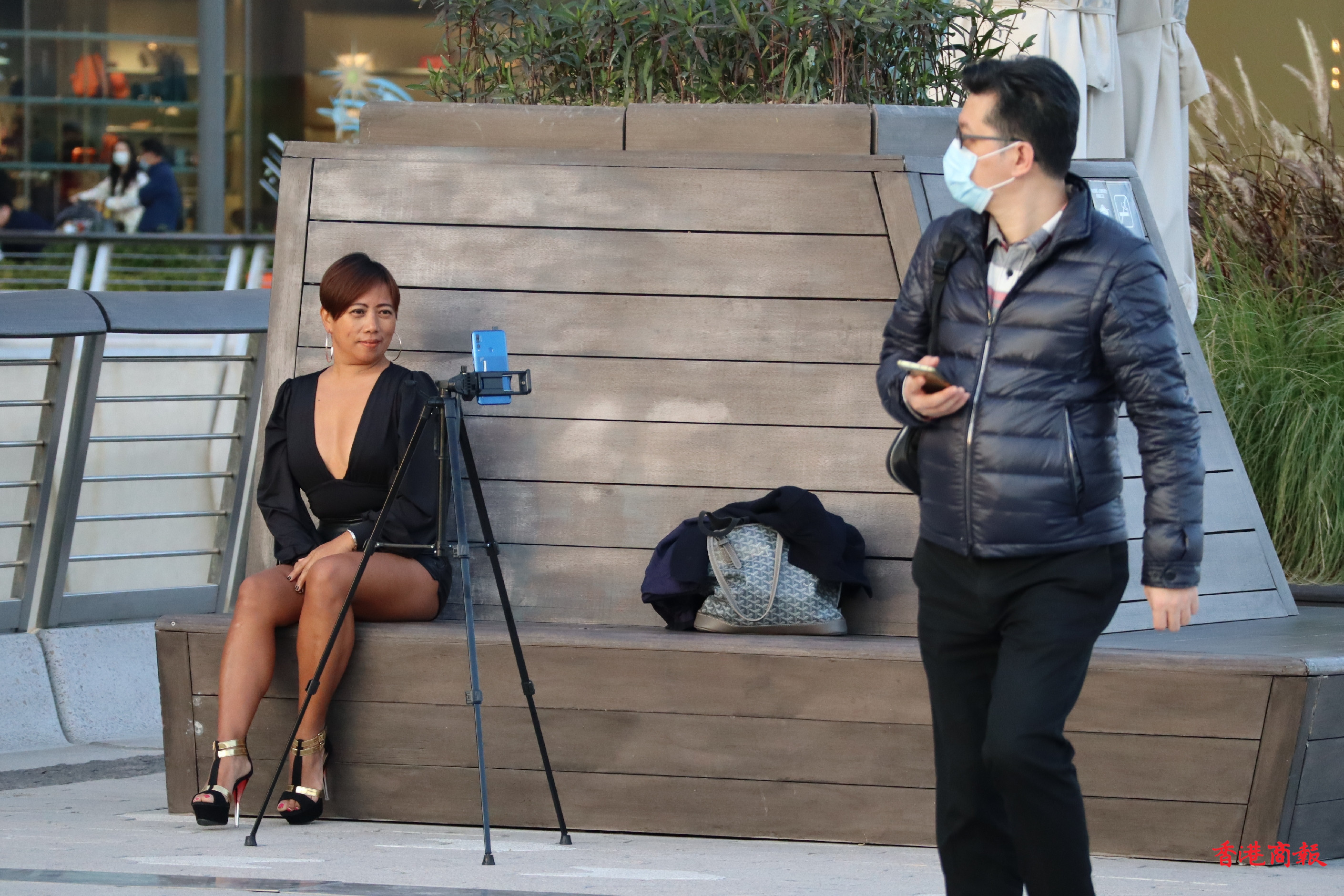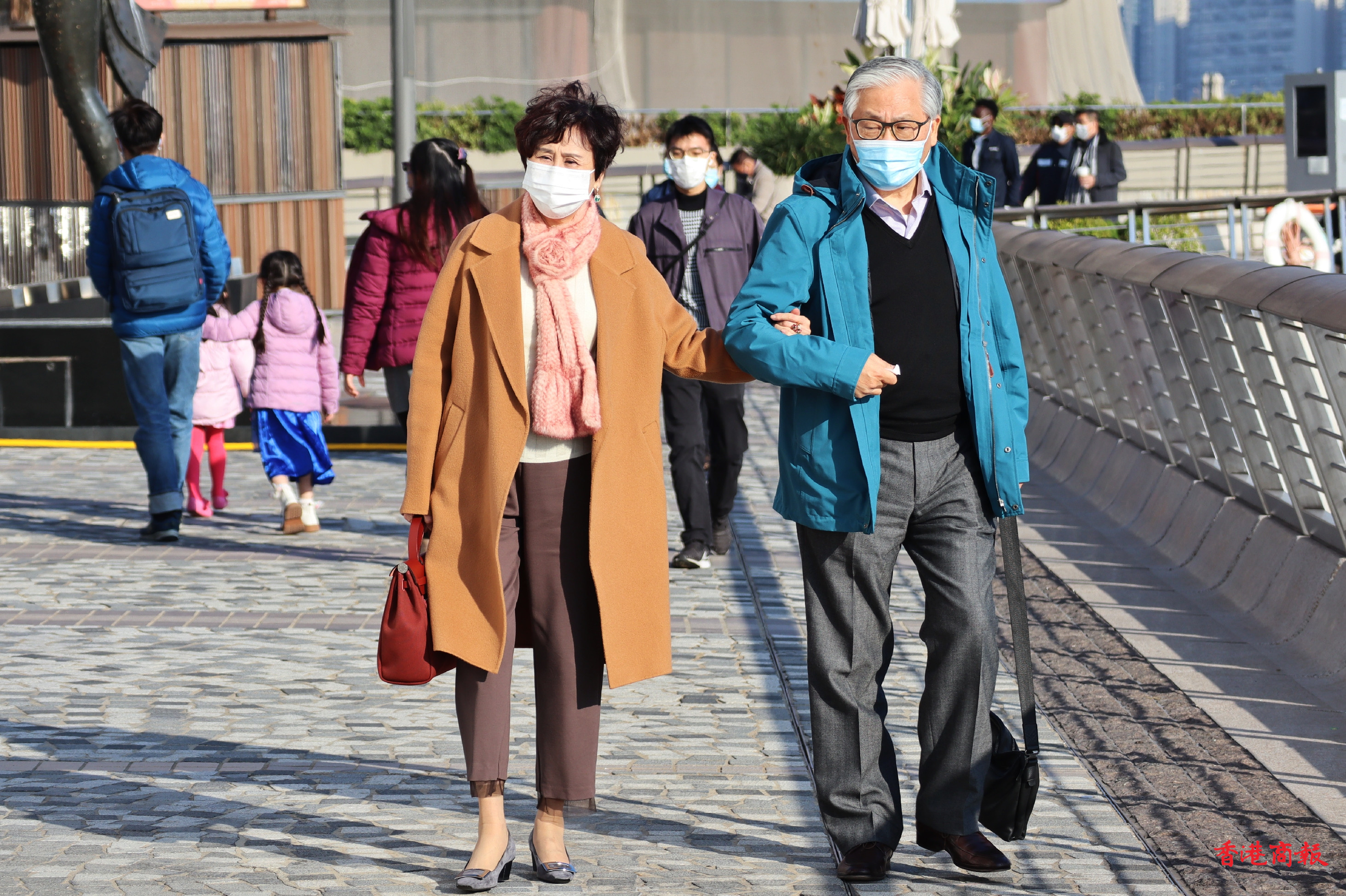 在街上的市民都加穿厚衣抵禦寒冷天氣,亦有不少市民無懼刺骨的北風在尖東海傍跑步;亦有穿著單薄衣服的女士在拍照,與穿著羽絨褸的人形成強烈對比。(馮瀚文 攝)