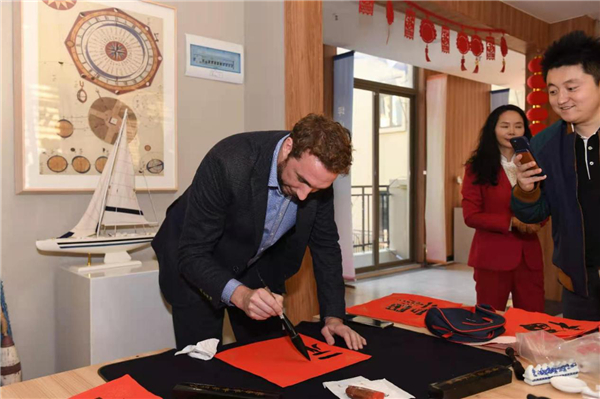 隨後,申益春老師現場揮毫潑墨,為大家演繹書寫了「福」字。隨即,他為大家展示了一幅康熙禦筆寫下的「天下第一『福』」作品,並介紹中國書法有多種形態,好的書法作品往往融入了創作者的理念、思維和精神,就像康熙寫下的「福」字一樣,這是當年康熙為祖母孝莊太後「請福續壽」寫下的震鑠古今的「長壽之福」,暗含了「多子、多才、多田、多壽、多福」,也是古今唯一的「五福合一」之福。人才們津津有味地聽申老師講述中國書法背後的歷史底蘊和深邃內涵,最後還不忘留下自己的「墨寶」以作紀念。來自德國的Akeksandra Ola表示,她早就了解到在世界各國的文字書寫中,漢字書寫是唯一發展為獨特藝術形式並源遠流長的,而今天能親自手執毛筆寫下新年祝福,「這種感覺太神聖了」。