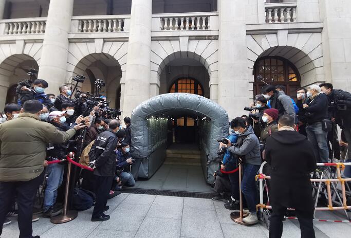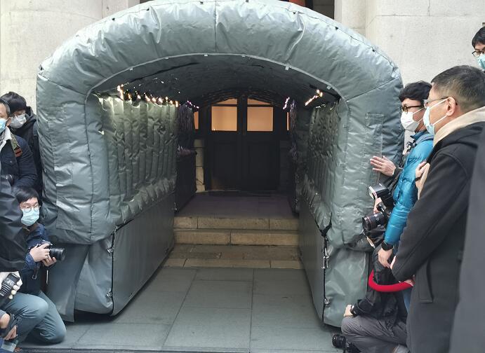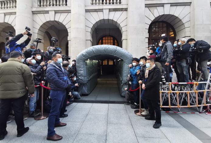 警方在终院门外搭起「時光隧道」,黎智英應該會從這裏出來。记者木子摄