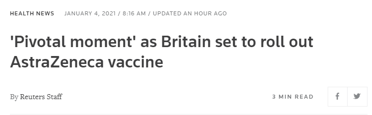 據路透社消息,當地時間4日,英國開始為民眾接種牛津大學和阿斯利康聯合研製的疫苗,是全球首個使用這款疫苗的國家,初期只會在少數幾間醫院使用,隨後陸續供應到全國。