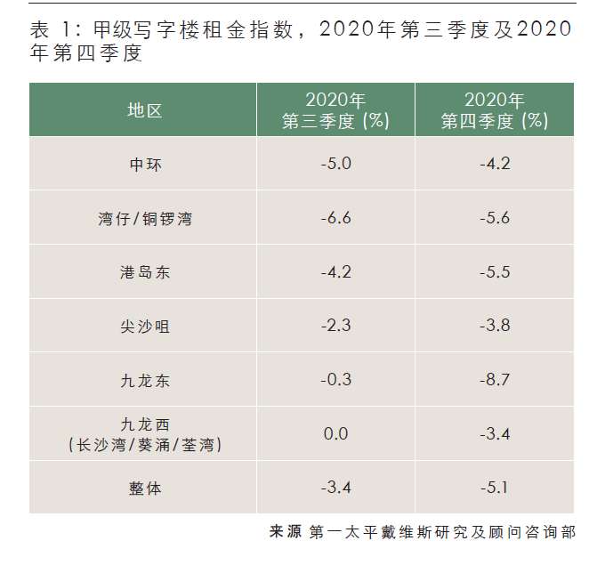 第一太平戴維斯預期,整體甲級寫字樓租金將在2021年下跌5.0%至10.0%,大部分下調將於上半年出現,而假若疫苗有助紓緩疫情,跨境通行得以恢復,寫字樓租金有望於下半年回穩。