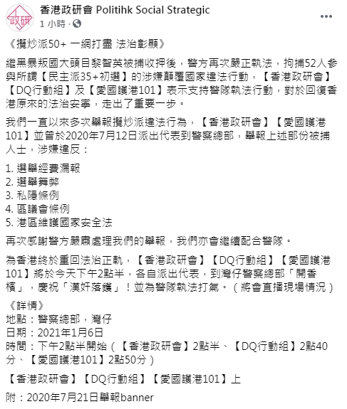 團體「香港政研會」今日(6日)在社交網站發文表示,繼黑暴叛國大頭目黎智英被捕收押後,警方再次嚴正執法,拘捕52人參與所謂「民主派35+初選」的涉嫌顛覆國家違法行動,「香港政研會」、「DQ行動組」及「愛國護港101」表示支持警隊執法行動,對於回復香港原來的法治安寧,走出了重要一步。