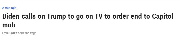 據CNN消息,美國當選總統拜登6日發表電視講話,形容美國遇到「史無前例的襲擊」,並要求特朗普即時現身,遵守誓詞,阻止情況惡化。拜登說,「這不是抗議,是暴動」,「全世界都在注視著,令我們震驚的是,我們的國家,這麼久以來一直是光明的燈塔和民主的希望,现在來到了這樣一個黑暗的時刻。」