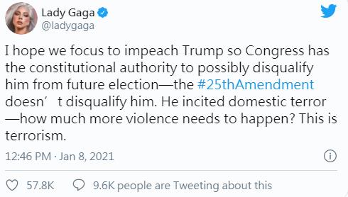 Gaga周四在推特發帖鼓勵公眾與國會繼續推動針對特朗普的彈劾。她炮轟特朗普煽動暴亂,認為這是恐怖主義行為。