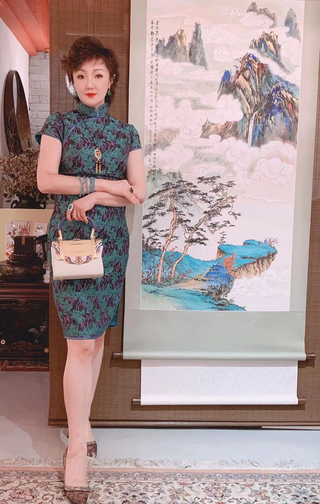 鄭優美表示,萬玉山房未來會持續向高端發展,發掘、收藏有價值的精品。背景圖是國家一級美術師處凡的青綠山水畫。