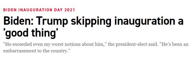 拜登說在接受採訪時回應說,「他(特朗普)不出現是件好事。」,「他甚至超越了我對他最糟糕的看法,」當選總統說,「他一直是這個國家的恥辱。」
