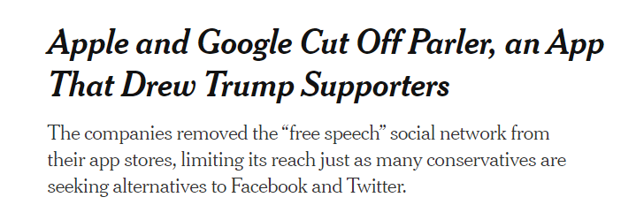 據紐約時報消息,繼谷歌從其應用商店中撤下Parler後,蘋果應用商店亦宣布,將無限期下架社交應用Parler。據悉,Parler是一款廣受特朗普支持者歡迎的社交媒體應用程式。