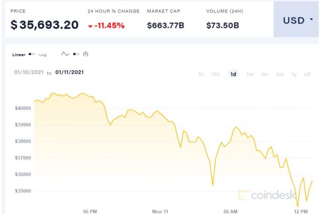 根據交易平台Coindesk報價,比特幣最新報35693元,跌11.45%,市值6637.7億元。比特幣上周曾高見42962元,24小時內高位40986元,最低曾見33542元,高低位波幅達7444元。