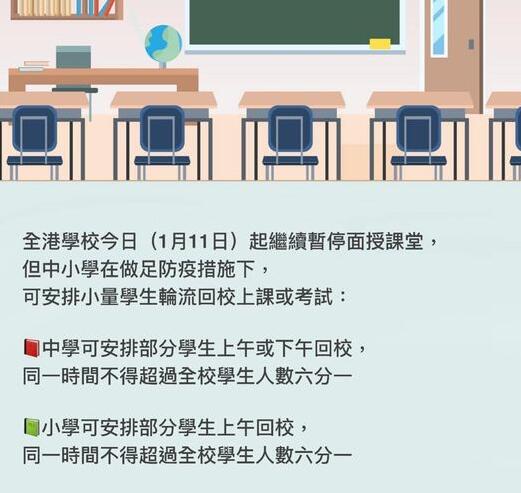 教育局局長楊潤雄在社交平台表示,由今日(11日)起,中小學在做足防疫措施及維持最多1/6學生回校的前提下,學校可考慮安排除小六及中六學生外的其他班別學生輪流回校半日上課或考試。