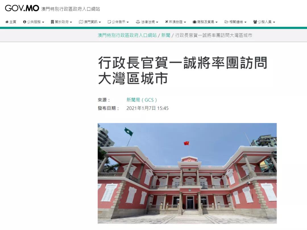 在啟程訪問之前,澳門特區政府網站發布消息:賀一誠特首本月8日起開始訪問粵港澳大灣區各城市,與各市領導會面及考察當地的產業發展項目,進一步深入推進粵港澳大灣區建設工作。