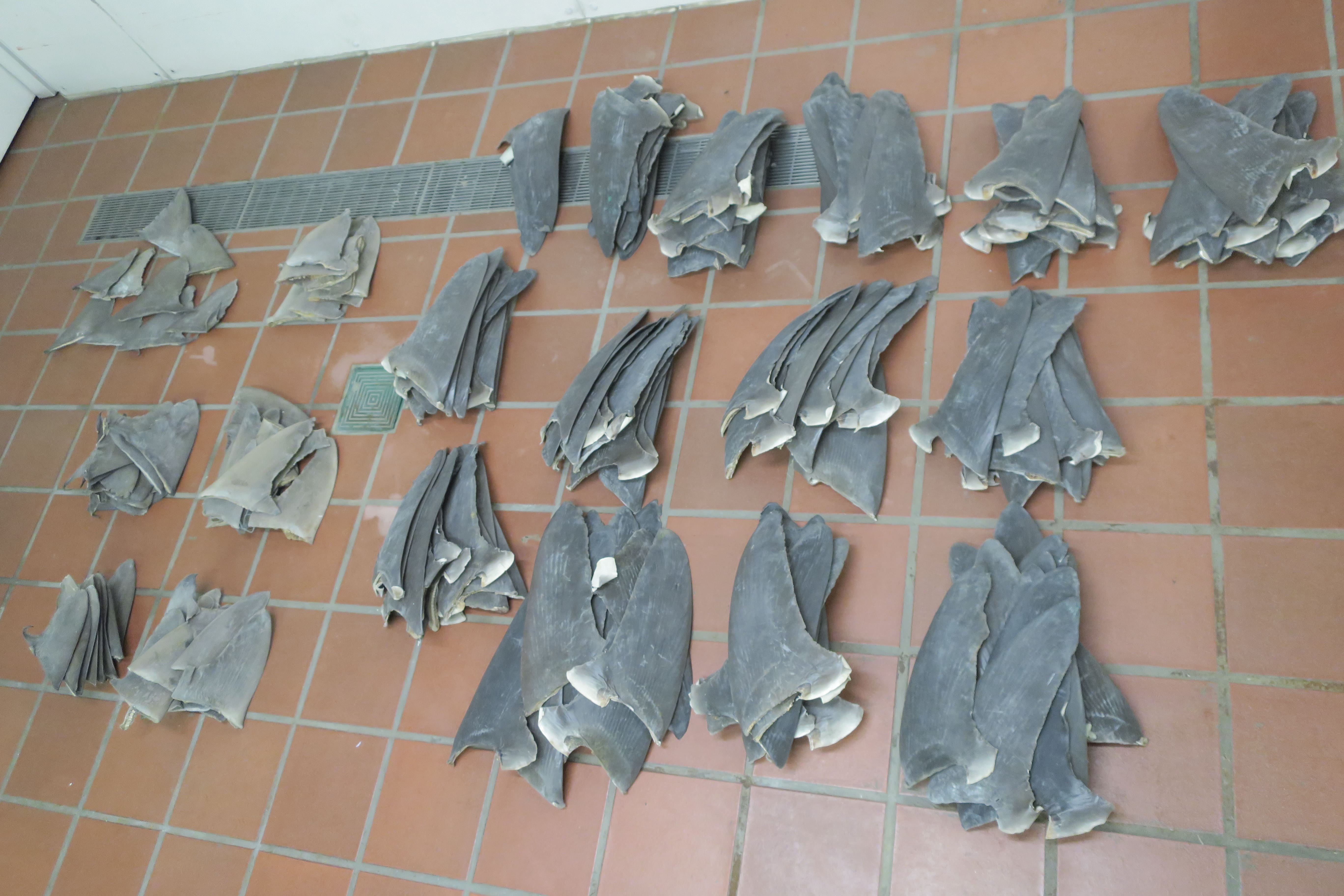 3名旅客因走私乾魚翅及乾海馬,違反《保護瀕危動植物物種條例》罪名成立,今日(11日)分別被判監禁18個月。圖為海關人員在該3名旅客的行李中發現的部分乾魚翅。