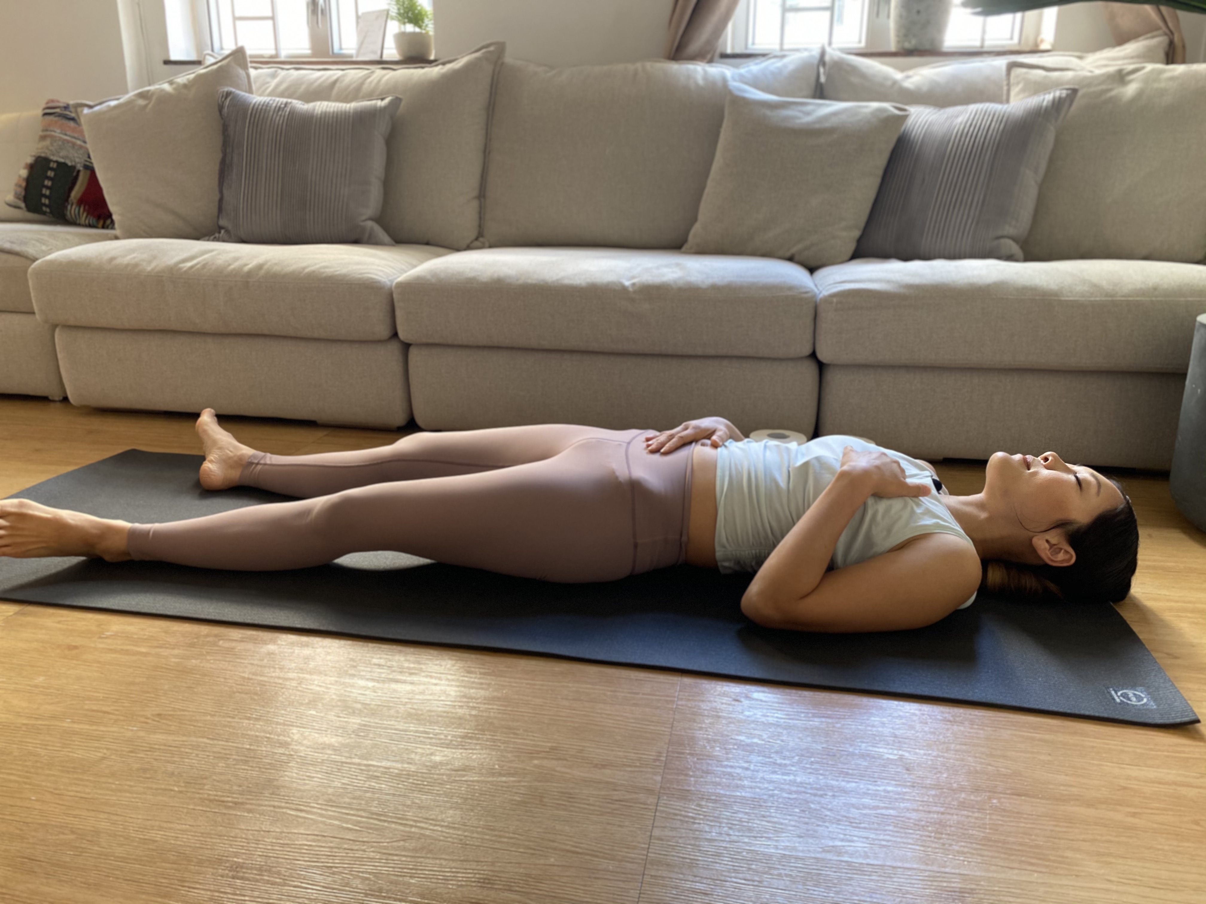 做法:首先把一個廁紙卷放在肩胛骨的中間位置,躺在瑜伽墊上,第二個廁紙卷放在頭下,放鬆膊頭,雙手向後伸展,放鬆2至3分鐘,保持長而慢的呼吸。之後雙手十指緊扣,進行伸懶腰伸展全身,可多伸展幾次。完成後雙手捉著瑜伽墊的兩旁,透過手肘力撐起心口,慢慢地將廁紙卷移開,再躺下保持三個呼吸,讓身體放鬆。
