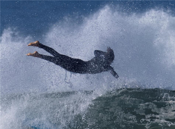 巨浪扑来,冲浪者瞬间飞离浪头。